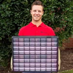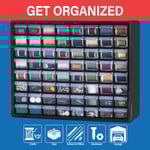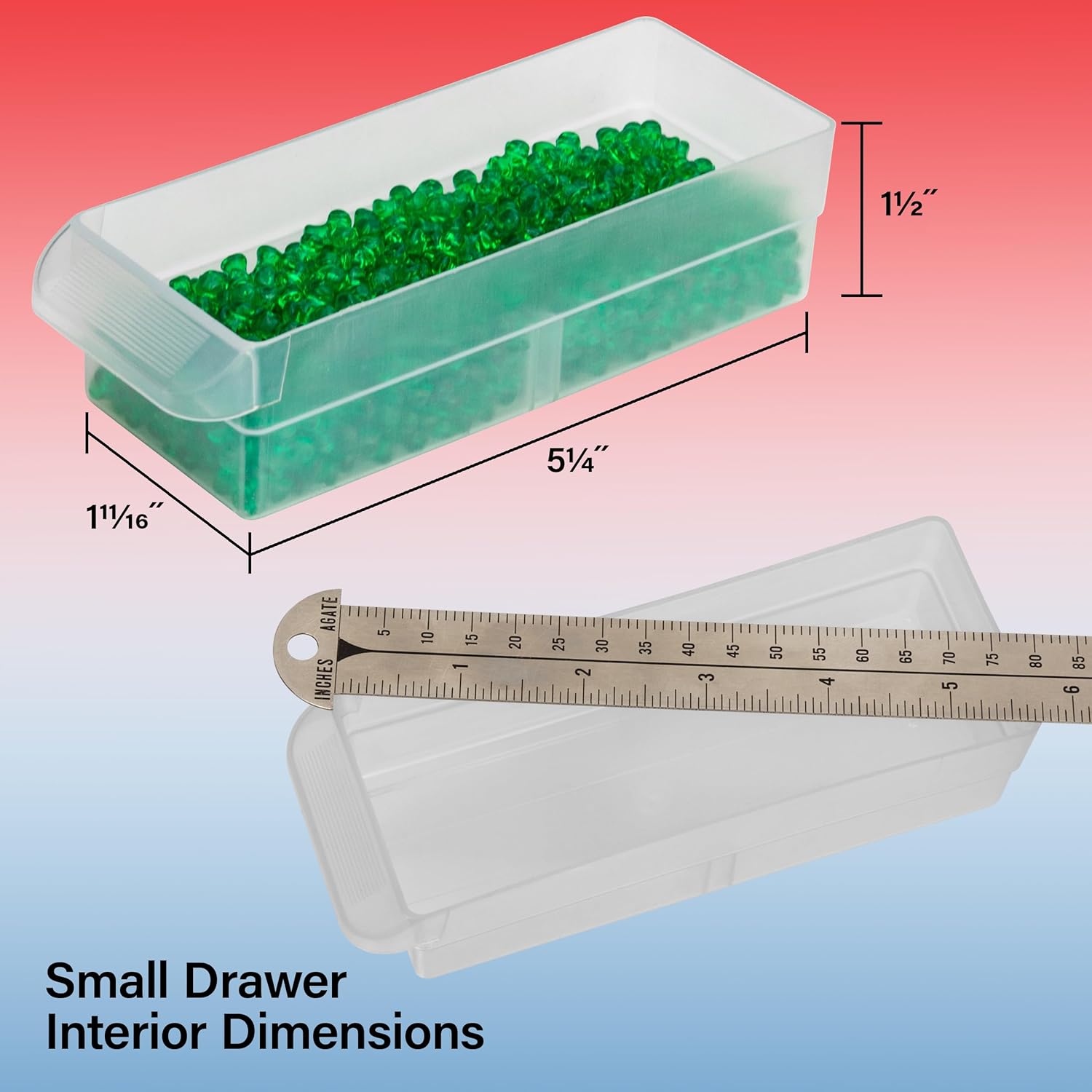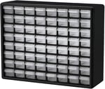 Cabinet, Parts Storage, 64 Compartments. Strong plastic cabinets organize and protect components. Cabinets Stack securely and can also be wall mounted with keyhole slots. Clear polypropylene, dividable drawers offer easy content identification. Finger-grip drawer pulls provide easy access and rear stop tabs prevent contents from spilling. Drawer: 6" x 2-7/32" x 1-9/16".
